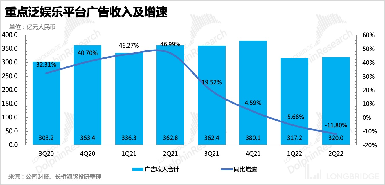 这也意味着,泛娱乐平台的广告收入规模还将持续低迷,但可能因为去年下半年基数下降,同比下滑幅度上会比上半年有所放缓。