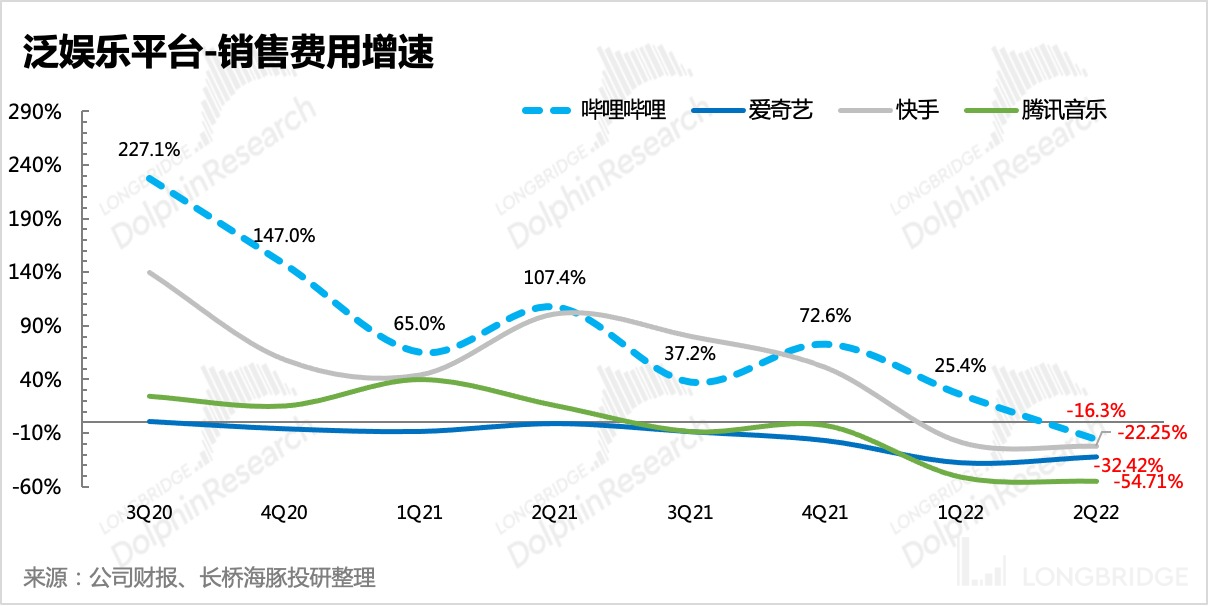 “降本增效” 是上半年互联网公司财报的关键词,尤其体现在泛娱乐平台上。以变动弹性最大的销售费用举例,上半年爱奇艺、腾讯音乐、快手、B 站,均对营销预算动了大刀。