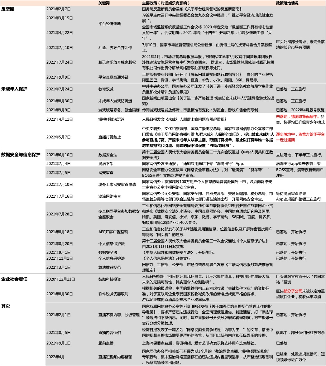 1、首先情绪面上,腥风血雨持续一年的行业监管在步入尾声(底色为灰的表示已落地/市场预期充分),目前处于逐步落地环节的主要为直播监管。但整体行业上,下半年尤其是年底,各公司业绩表现上会逐步体现监管影响的弱化。