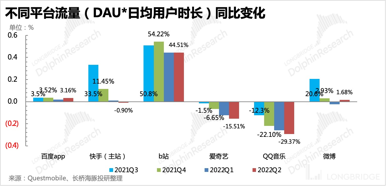 而如果本身的流量也在流失的话,那就是惨中惨了,比如爱奇艺、腾讯音乐。拥有闭环交易的娱乐平台,则面临的逆风要小一些,比如快手。