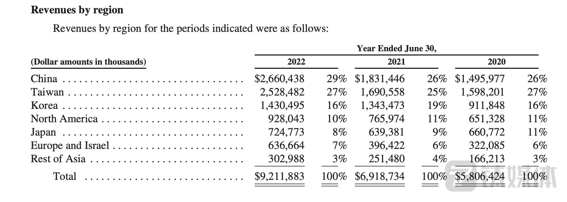 截至今年6月30日的2022财年业绩显示,中国(包括中国香港,不包括中国台湾)是科磊公司最大营收来源地。2022年92.11亿美元收入中,29%来自于中国,即26.6亿美元。此外,2020财年、2021财年中国区营收占比高达26%。