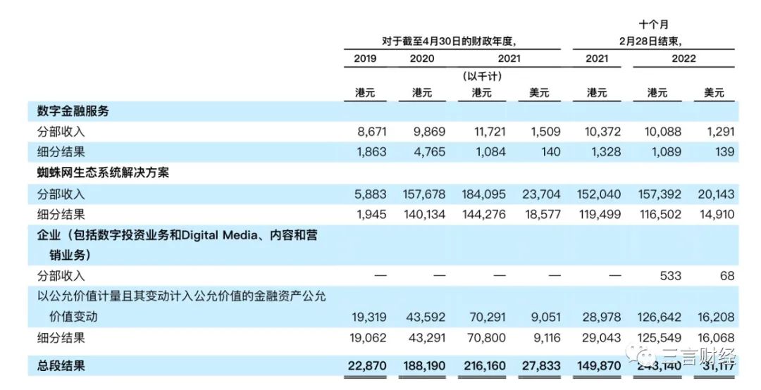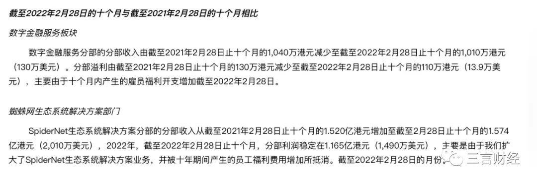 具体财务数据,根据招股书显示,公司2019年至2021财年以及截至2022年2月28日,数字金融服务分部收入分别为867万港元、987万港元、1172万港元和1010万港元;蛛网生态系统解决方案分部收入分别为588万港元、1.6亿港元、1.8亿港元和1.6亿港元;