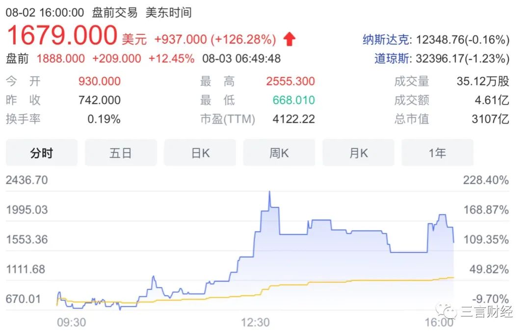 这两天,圈里都被这家叫做“尚乘数科”的妖股惊了。截至当地时间8月2日收盘,尚乘数科报1679美元,涨幅126.28%,总市值达到3107亿美元。