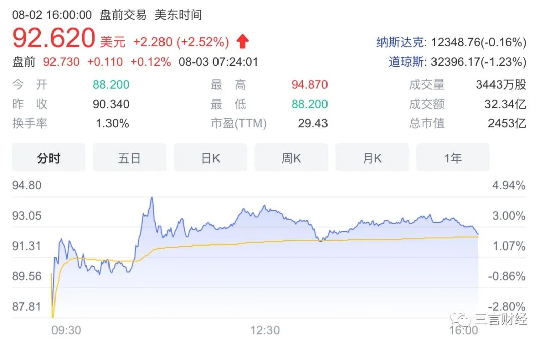 而同一时间,阿里巴巴美股股价报92.62美元,总市值2453亿美元;