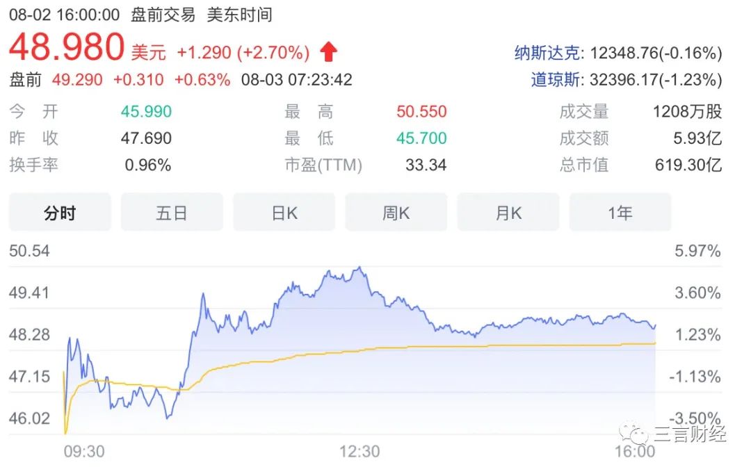 拼多多股价报48.98美元,总市值619.30亿美元;