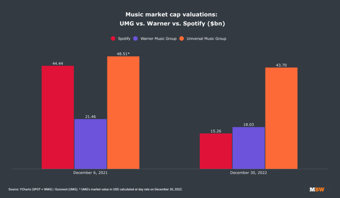 要知道,2021年年末的时候,环球音乐(452亿欧元)和Spotify(444.4亿美元)的市值还非常接近,而华纳音乐(214.6亿美元)则只有Spotify的一半。