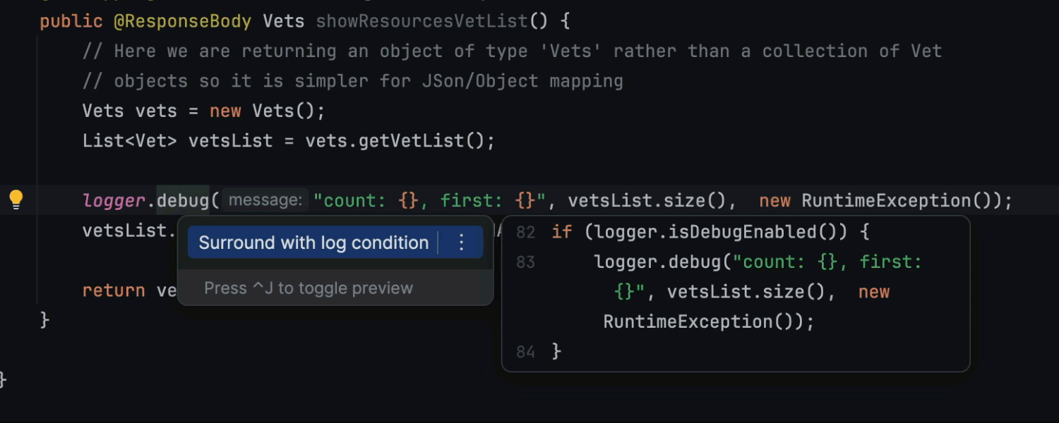 IntelliJ IDEA 2024.2 为 Java 引入了增强的日志管理。新功能包括字符串字面量的高亮显示和参数解析功能,允许你无缝地从占位符导航到相应的参数。更新的检查现在更好地处理不匹配的记录器参数数量,建议将