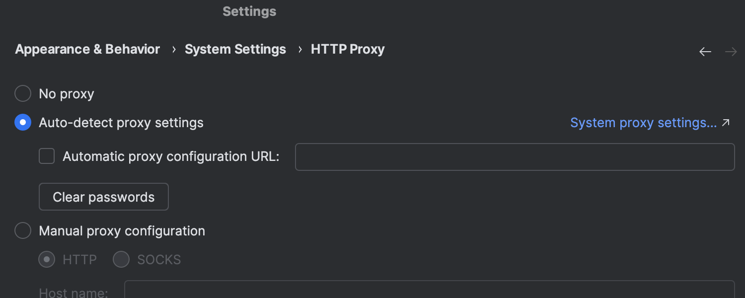 IntelliJ IDEA 现在会自动检测你机器上配置的系统代理设置,并默认使用它们,以便无缝地与外部资源和服务进行交互。
