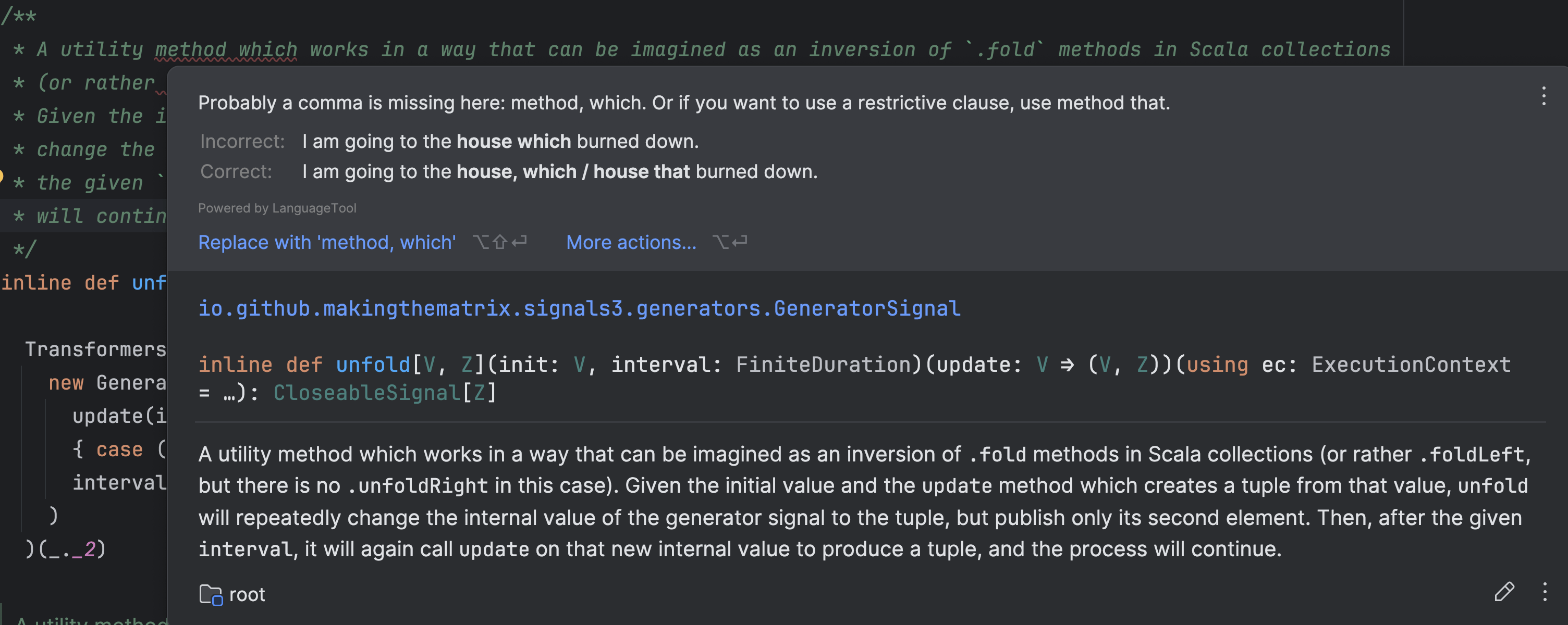的内容显示为字符串。IntelliJ IDEA 还为 Scala 提供了入门提示。在导入 sbt 项目时,现在可以看到库下载进度。此外,Scala 支持现在包括 Grazie 的功能,后者在 Scala 注释中提供高级拼写和语法检查。