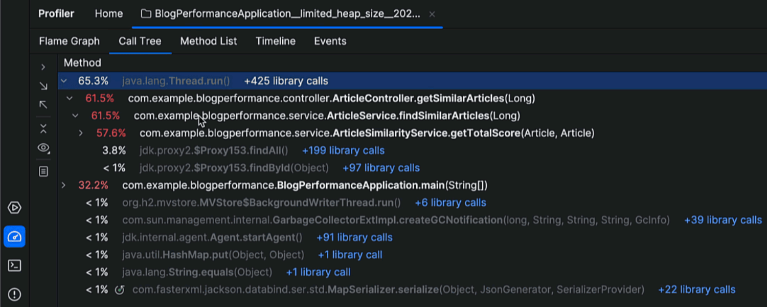 IntelliJ IDEA 的内置性能分析器已升级,简化了性能瓶颈的调查。现在,IntelliJ IDEA 在性能分析器中更关注你的代码,通过淡化和折叠库调用,确保你获取的性能数据集中在对应用性能影响最大的项目调用上,过滤掉不需要关注的方法。如果你需要查看库调用的详细信息,可以展开隐藏的调用以查看整个调用序列及相应的执行时间。点击调用旁边的超链接或