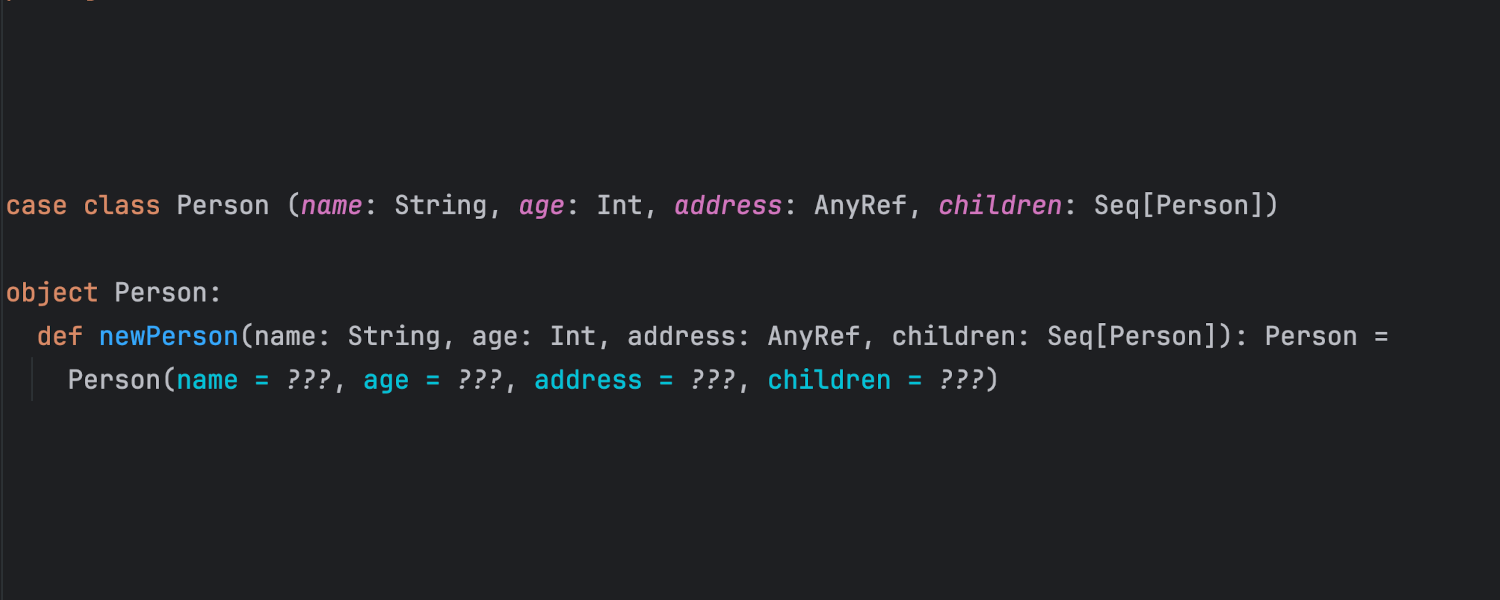 IDE 现在可以自动填写方法的所有命名参数,并在 Scala 3 中自动补全联合类型的文字值。当预期为枚举类型时,现在会建议枚举案例。此功能适用于 Scala 3 枚举和联合类型、Scala 2 ADT 和枚举以及 Java 枚举,通过提供更相关的建议简化你的编码体验。