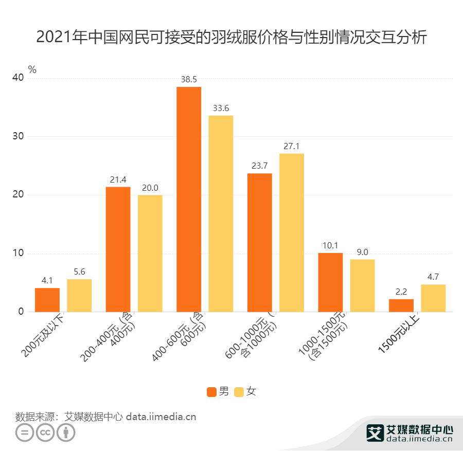 而根据艾媒咨询调研,2021 年中国网民可接受的羽绒服价格集中在 400-600 元,仅有 26% 的用户接受 1000 元以上价格带。