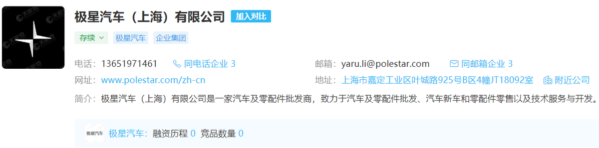 根据天眼查显示的公司简介,极星在国内的定位是一家汽车及零配件批发商,所属行业为批发业,并未将新能源、智能驾驶等相关技术列入营业范畴,智能化方面的估值想象力似乎并不高。