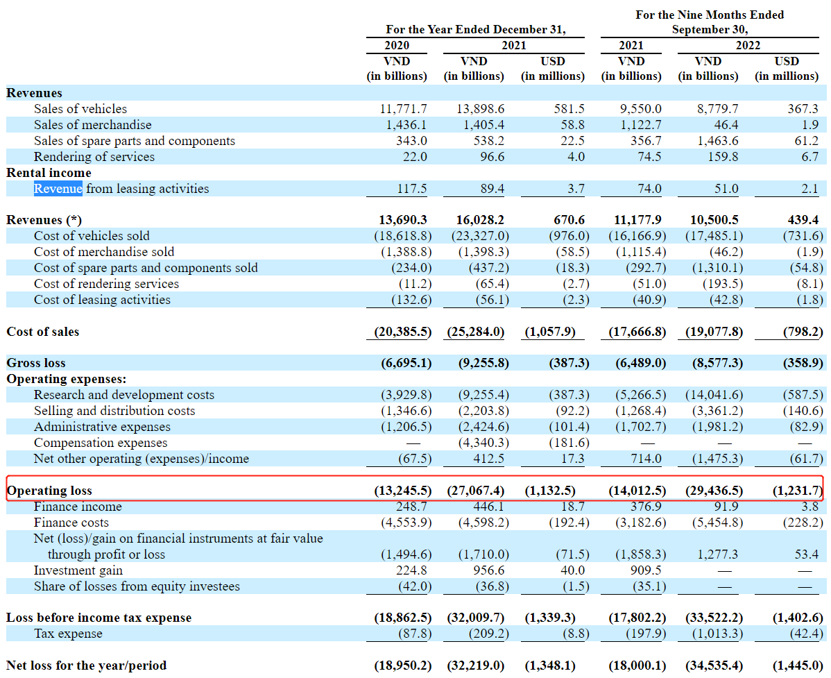 根据招股书数据,VinFast 2021财年运营亏损、净亏损分别为11.33亿美元和13.48亿美元,今年前三个季度这两项数据更是分别达到12.32亿美元和14.45亿美元。