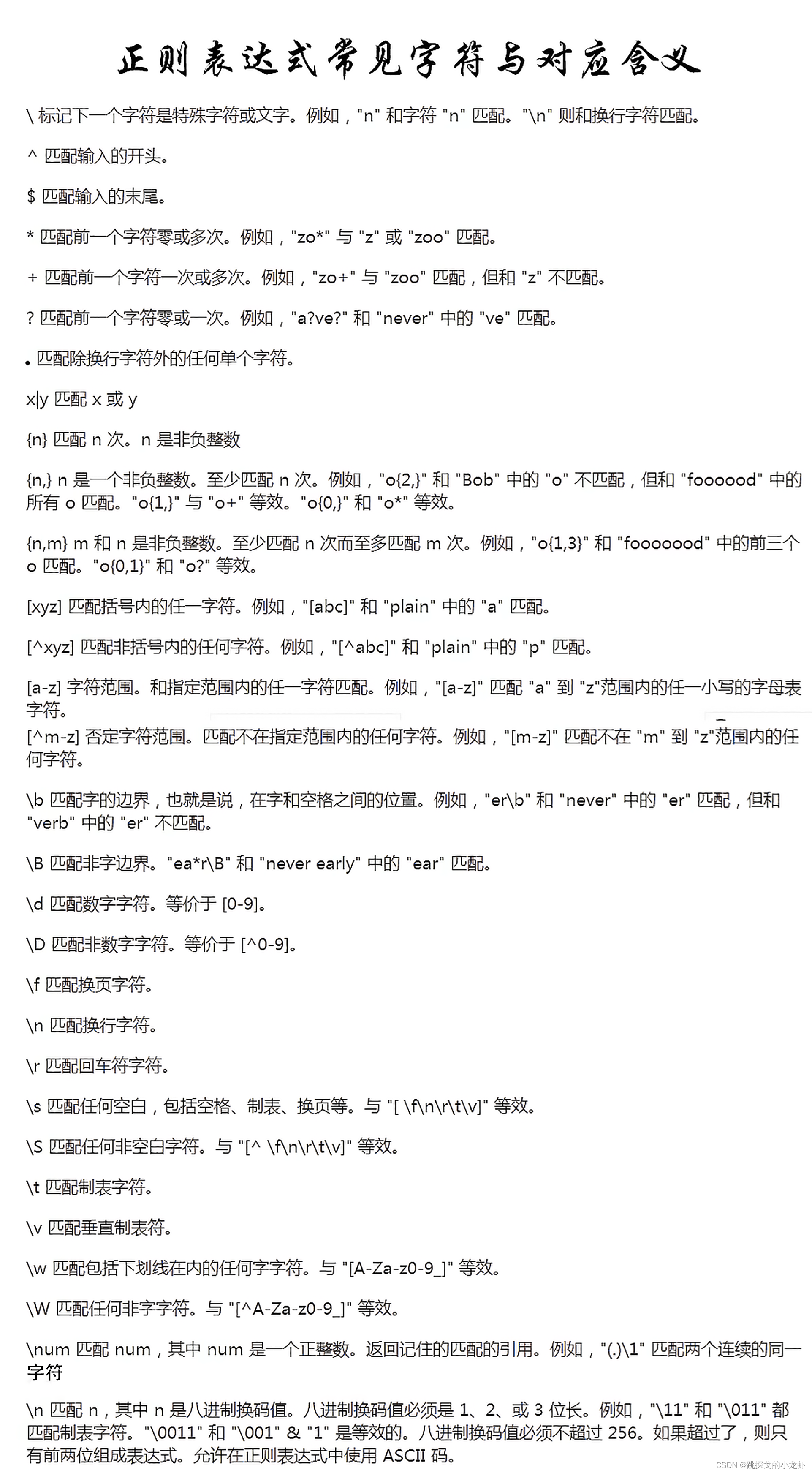 在前端,很多时候需要做数据验证,因此掌握正则表达式的使用对开发是有很大帮助的,具体的使用步骤不作讲解,仅用上图帮助大家速查正则表达式的书写!🌟🌟🌟