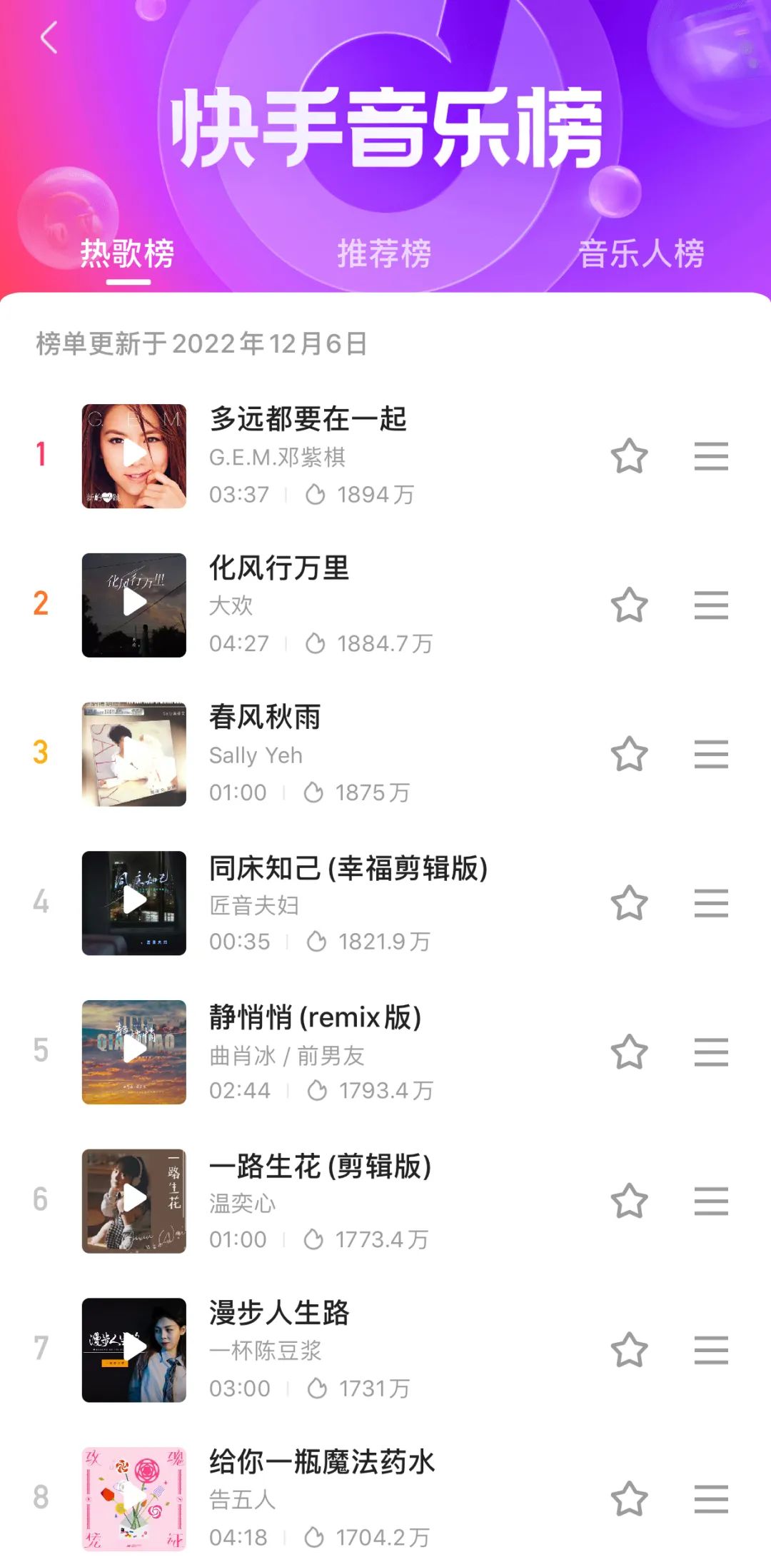 唯一还有点独立王国既视感的,是快手。除了《多远都要在一起》,榜单前几名中的《化风行万里》《春风秋雨》《同床知己》《静悄悄》倒和别家不同。尤其是叶倩文1996年发行的《春风秋雨》,真有金曲怀旧的况味。