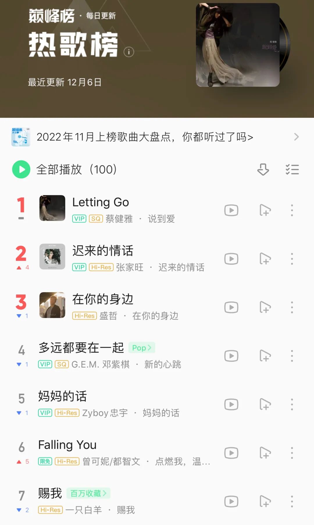 网易云和Q音的榜单同样怀旧。QQ音乐热歌榜前五名,只有一首《赐我》是2022年的新歌。《妈妈的话》是2021年的,《在你的身边》是2017年的,《多远都要在一起》是2015年的。TOP1则是蔡健雅发行于2011年的《Letting Go》。