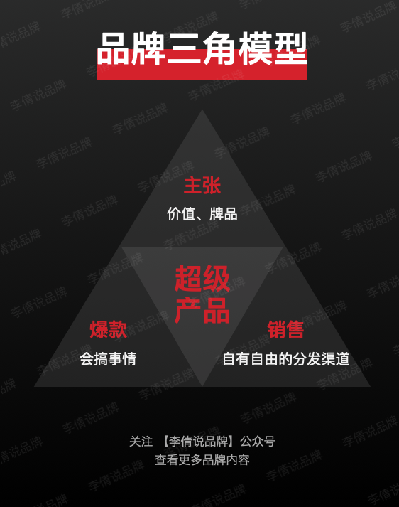 还记得刚才的品牌三角模型吗?三角形中间是超级产品,超级产品就是一个企业的核心,是你交付了怎样的东西。最上面的角叫做主张,是你的牌品,作为一个品牌的框架,你设计提供别人怎样的价值?左下角叫做爆款,我称之为搞事情;右下角叫做销售,是指有自由自有的分发渠道,一定要强调自由自有,是因为如果你依附于其他渠道发展,是很难把真正的销售建立起来的,三只松鼠没能在流量之后快速建立它的自由自有的分发渠道,就是典型的例子。在这样一个三角形里,品牌如果找不到战略优势,就不如去拼多多上做生意。这句话是我非常中肯的建议,如果你没有战略优势,你要拉流量、卖货,就直接按照生意的逻辑去做,那样反而更干脆。