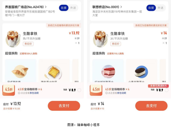 从商品种类和价格来看,这两家门店均可通过小程序点单,基本和一二线城市一致。如界首国祯广场店和北京联想桥店售卖的瑞幸生酪拿铁在均选择大杯的情况下,价格都是在14元左右。