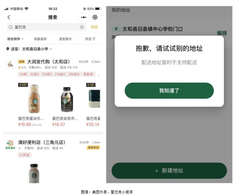 最后,很多乡镇到主城区距离过远,使咖啡品牌方所依赖的配送体系难以覆盖,因为不管是美团、还是饿了么,以及星巴克自身运力,对于乡镇一级均不支持配送。