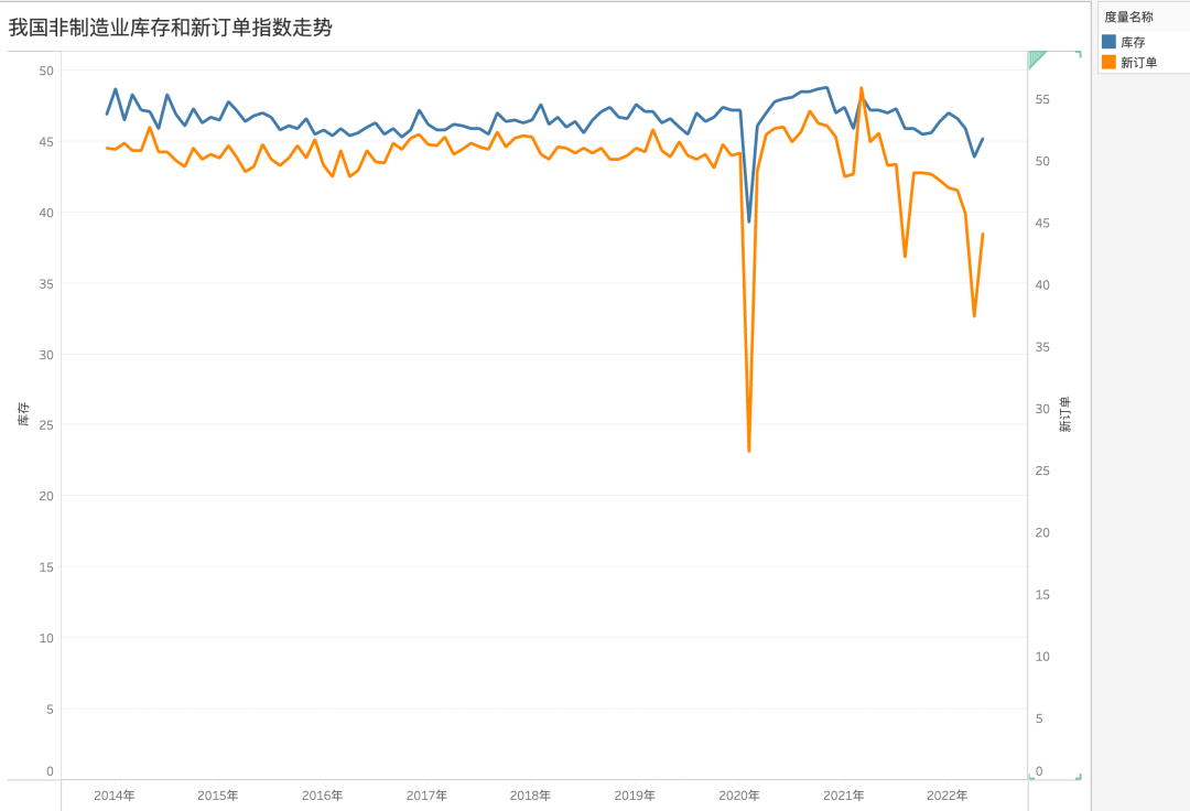 如制造业类似,非制造业亦要保持库存和新订单的默契关系,到但在2021年下半年之后该默契界限被频频打破,新订单指数出现严重下行压力(历史上仅次于2020疫情之初),库存和新订单之间差值开始放大到历史最高水平。
