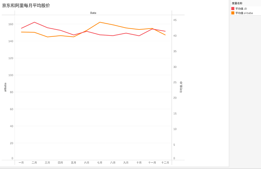 我们整理了阿里和京东两家企业自上市之后股票走势,并按月整理平均值。可以看到很有意思的现象: