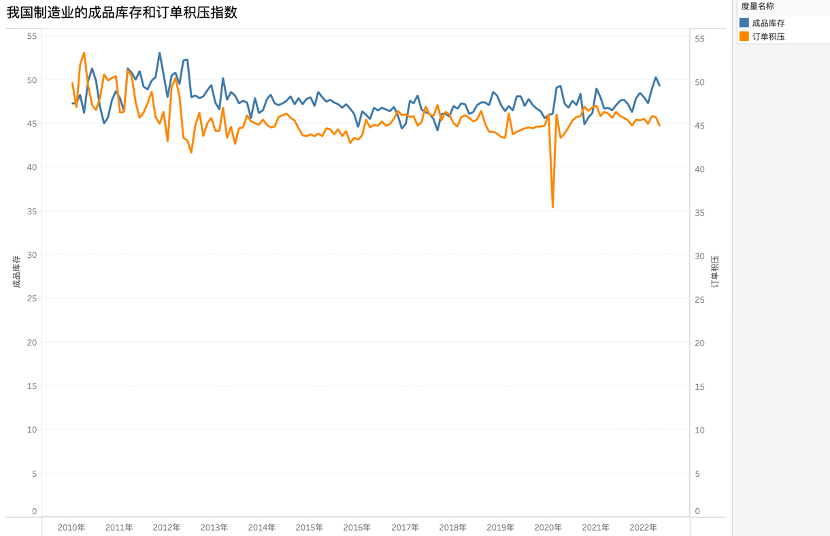 根据物流与采购联合会的数据,整理了我国制造业成品库存和订单积压情况,见下图: