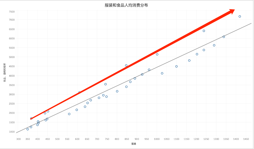 根据统计局数据,我们整理了服装和食品(包括烟酒)的人均消费情况,非常有意思的是,从2020年Q1-2022年Q1,点状分布全部处于拟合线之上。如果我们将服装视为非刚性消费,食品和烟酒视为刚性消费,就很明显可以得出:在疫情后的我国居民的消费偏好日渐理性,降低非刚需消费比重。