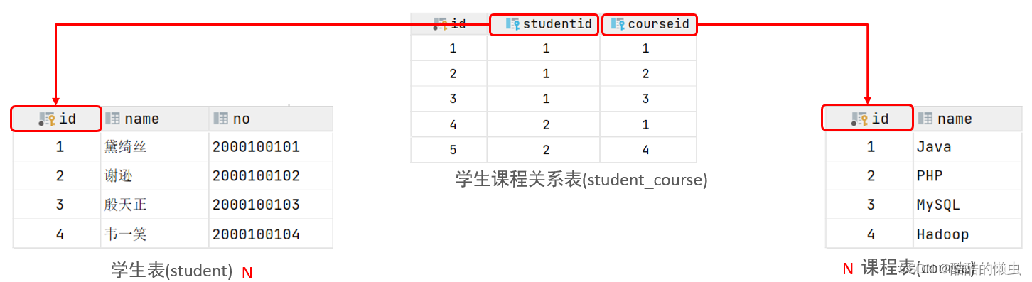 courseid intnotnullcomment'课程ID',constraint fk_courseid foreignkey(courseid)references course (id),constraint fk_studentid foreignkey(studentid)references student (id))comment'学生课程中间表';insertinto student_course values(null,1,1),(null,1,2),(null,1,3),(null,2,2),(null,2,3),(null,3,4);