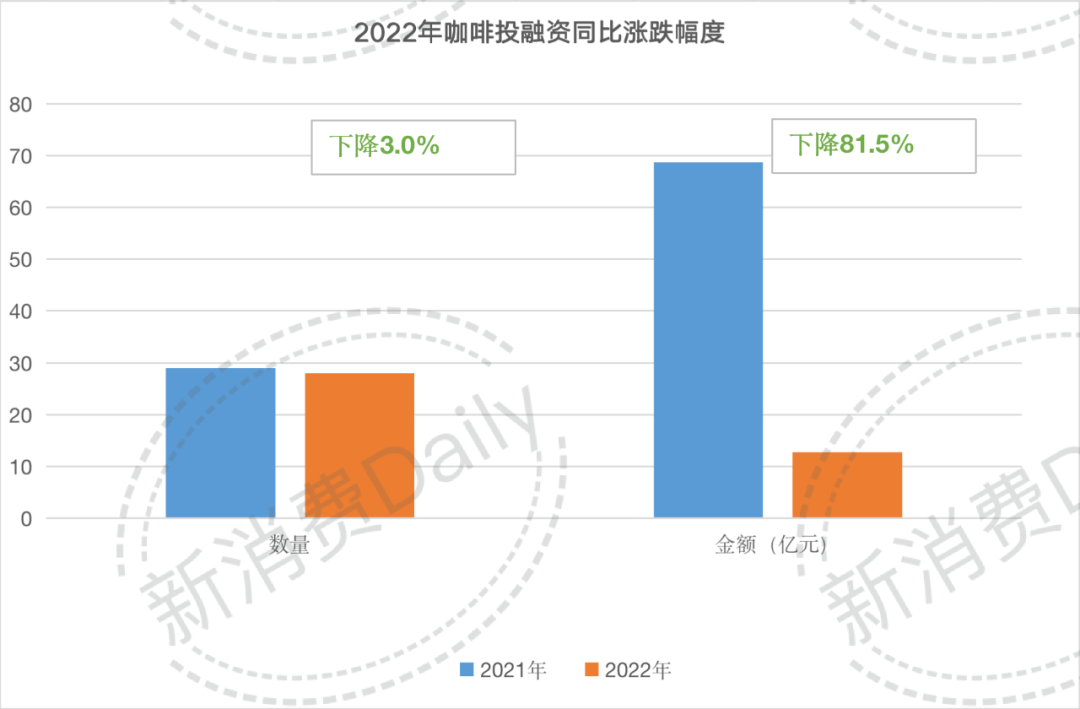 1.据新消费Daily不完全统计,2022年共有28个咖啡品牌获得融资,金额约为12.7亿元。融资数量只比2022年减少了1轮,但由于有12轮未披露具体金额,再加之资本谨慎,消费遇冷的影响,融资金额跌幅大概为80%。