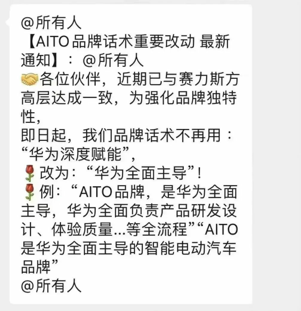 实现这样的掌控后,余承东和华为或许依然不满足。近日,一张截图在一些汽车销售群中流传,内容主要是疑似华为智选车方面已经与赛力斯方面达成一致,之后华为门店销售在介绍AITO品牌和问界系列车型时,用“华为全面主导”的话术替代此前的“华为深度赋能”。