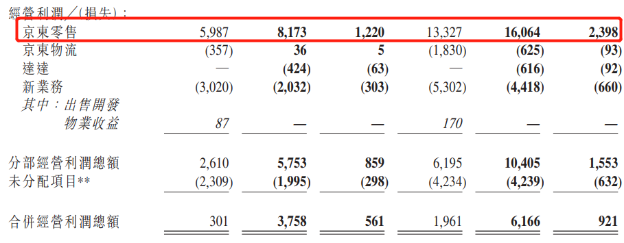 可以看出,京东的分部经营中几乎只有零售是正向盈利。