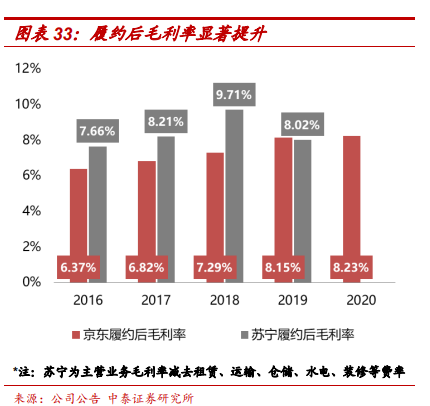 另外,中泰证券的一份报告显示,京东履约后的毛利率逐渐上升到2019年已经超过了苏宁。