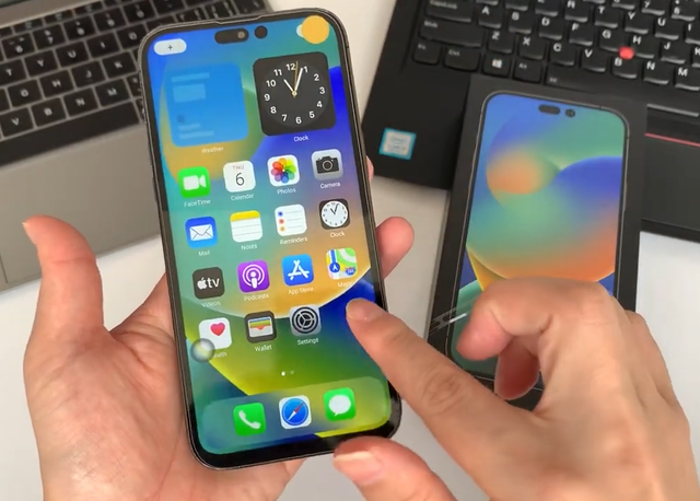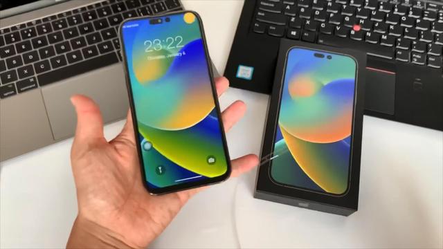 从博主公布的视频截图来看,这台来自华强北的iPhone 14 Pro Max在表面功夫上做足了功课,从包装盒上就能看到一大一小两个挖孔所组成的“感叹号”模组,也就是之前传了整整一年的感叹号设计。