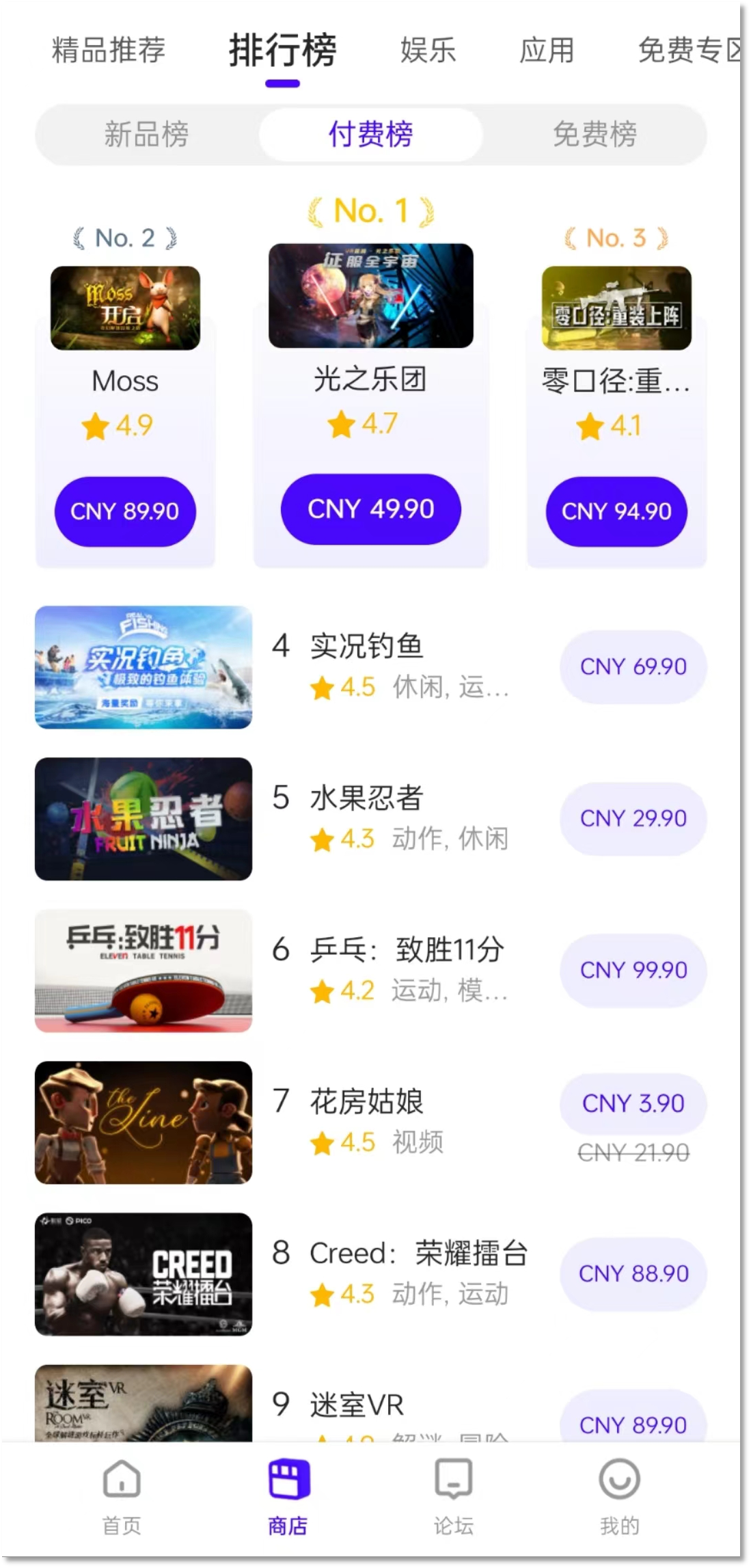 而在PICO官方商店中,单个游戏资源从几块钱到99.9元不等,以当前的PICO商店付费榜来看,排名第一的《光之乐团》售价49.9元,排名第二的《Moss》卖89.9元,排在第三的《零口径:重装上阵》售价94.9元。仅计算Pico商店排行前20的付费游戏,全部买齐共计需要花费1265.2元。