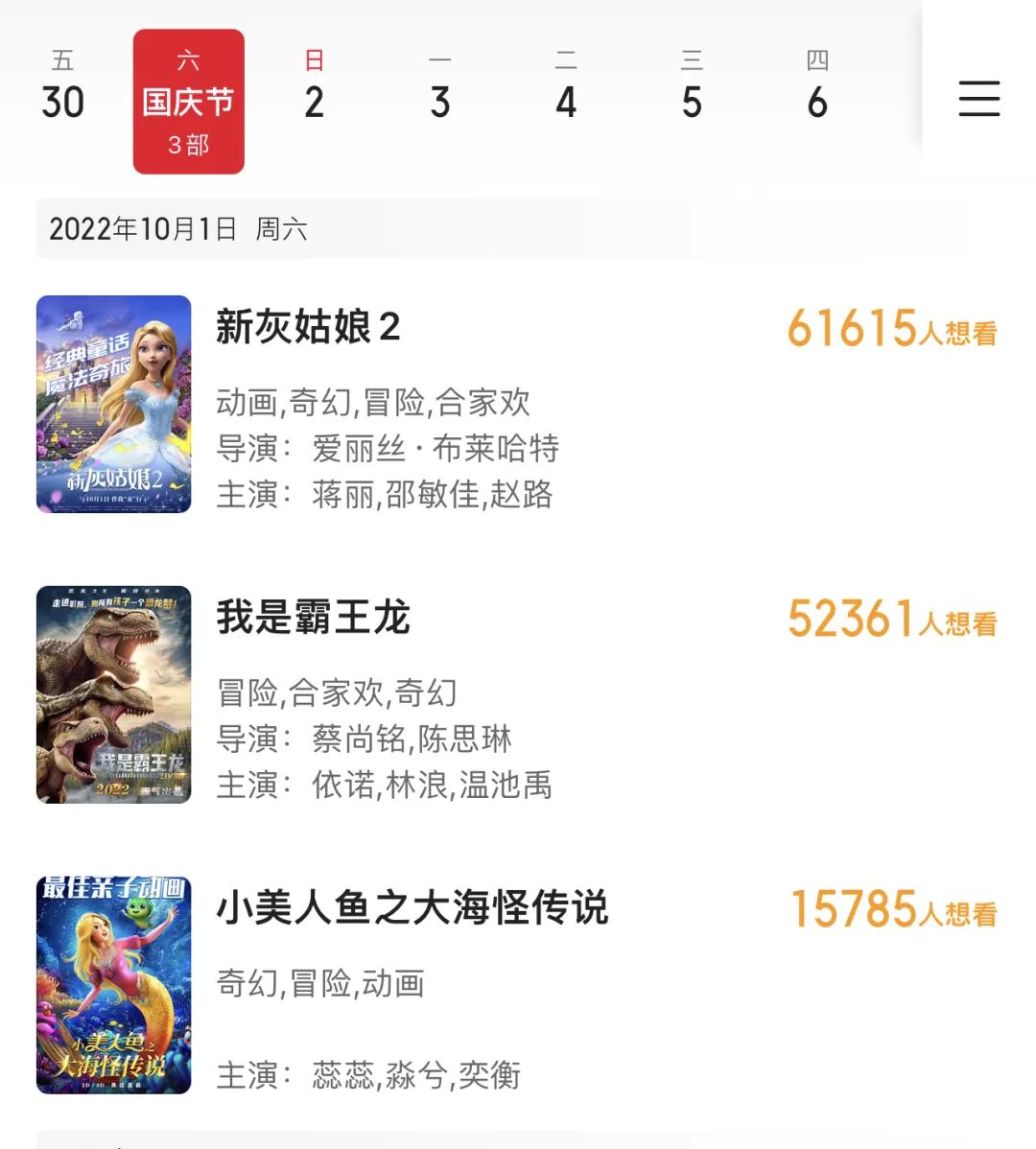 截止发稿前,国庆档只有《新灰姑娘2》《我是霸王龙》《小美人鱼之大海怪传说》3部影片定档。更显严峻的是,这3部影片都是小体量动画片,猫眼累计想看人数不足13万人。