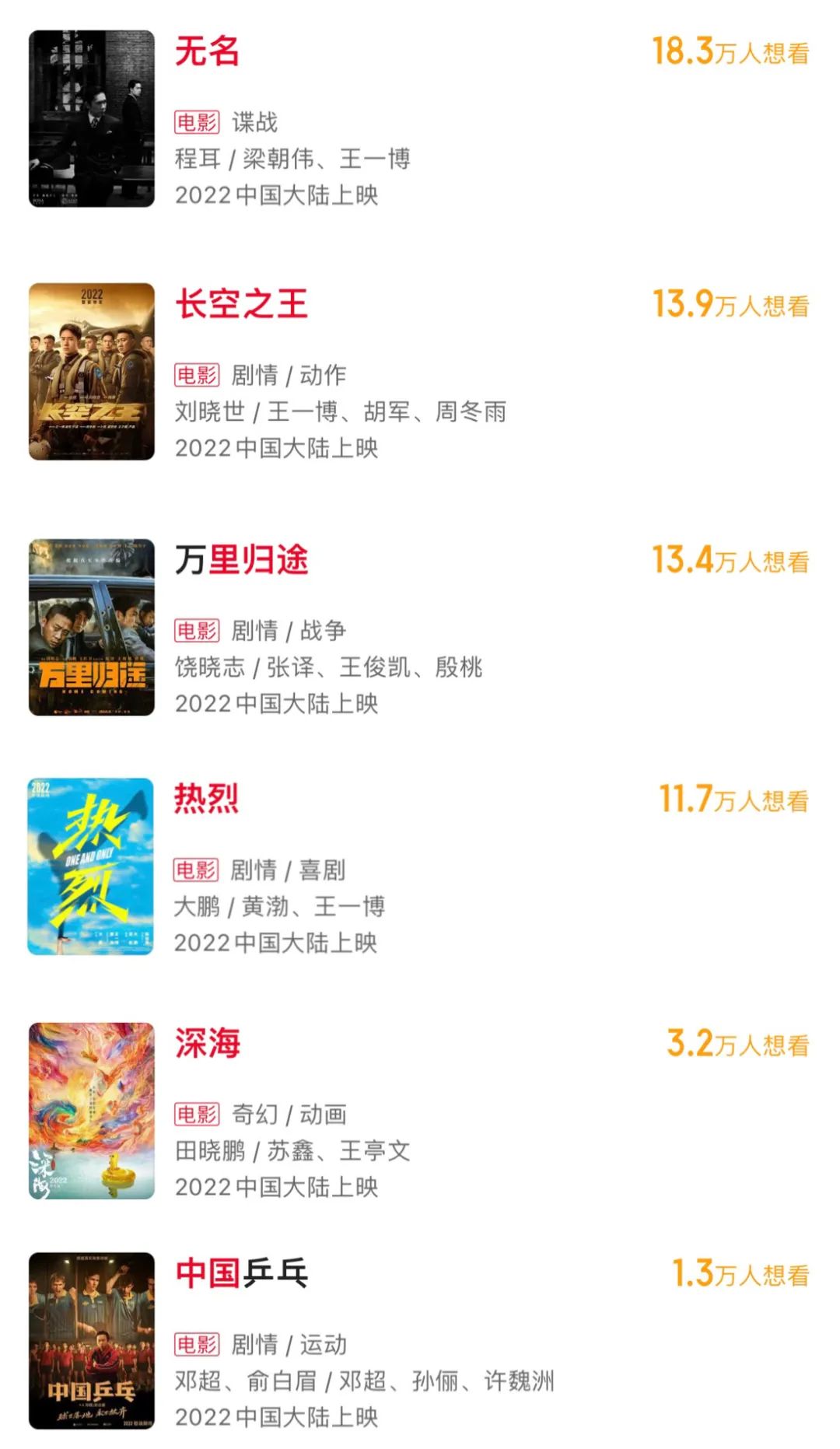 在此之前,光线传媒已明确透露《深海》会在今年下半年上映,《长空之王》《无名》皆被爆预定国庆档。