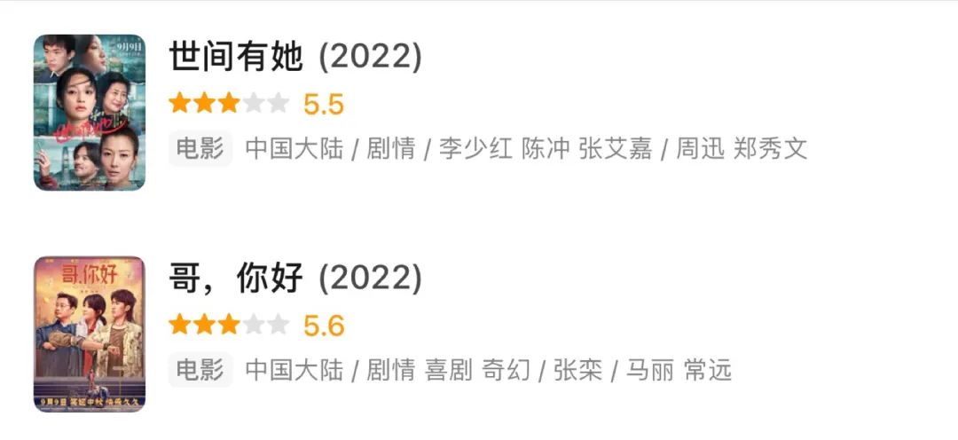 头部电影公司群英荟萃,但交出的基本是缺乏市场期待的中小体量级影片,质量方面又难带起社交平台上的口碑发酵,两部因璀璨明星阵容而较具关注度的影片《哥,你好》《世间有她》,豆瓣评分都未过及格线。