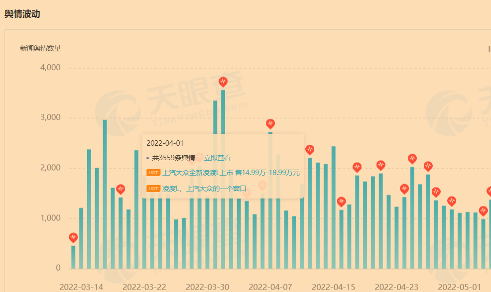 天眼查APP舆情信息显示,4月1日上汽大众的舆情量达到高点,这似乎也正是在凌渡L横空出世的加持下得到的结果。