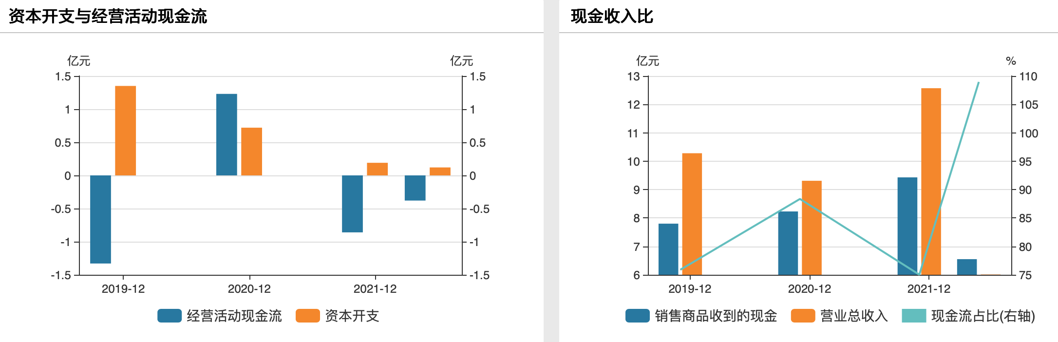 应收账款和存货占用了大量资金,结果就是公司的现金流不断承压。2019-2021年及2022年上半年,京磁股份归母净利润分别为7122.82万元、5055.06万元、8125.93万元和5509.93万元,但同期经营活动产生的现金流量净额分别为-1.33亿元、1.23亿元、-8628.07万元和-3776.30万元,业绩含金量非常堪忧。