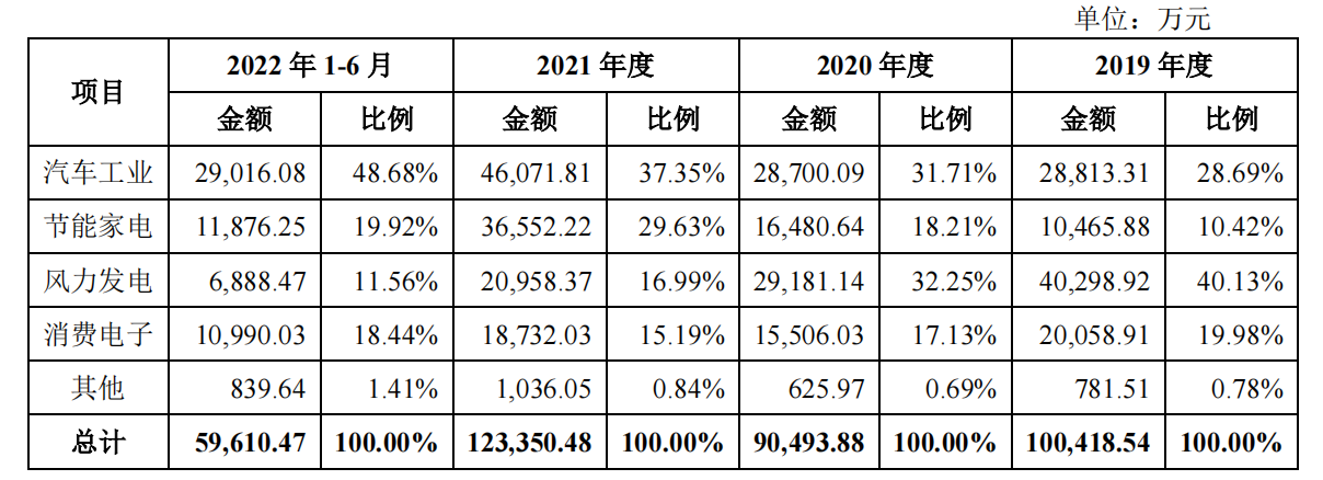 同时,公司下游行业波动也较大,对其经营稳定性造成一定影响。报告期内,汽车工业领域的销售收入占比分别为28.69%、31.71%、37.35%和48.68%;风力发电领域的销售收入占比分别为40.13%、32.25%、16.99%和 11.56%,均出现较大波动。