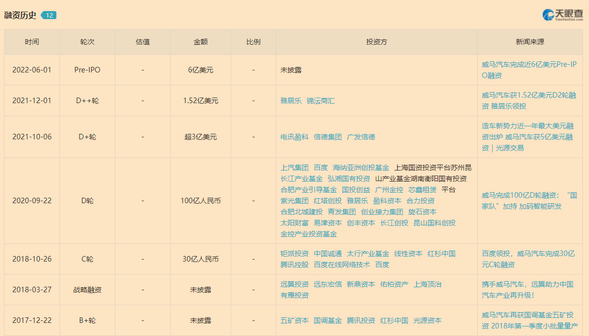 但威马的IPO之迫切并不难察觉,天眼查APP信息显示,截止今天威马汽车已经累计融资超过10轮,相关信息显示,其总融资额也已经突破300亿人民币。