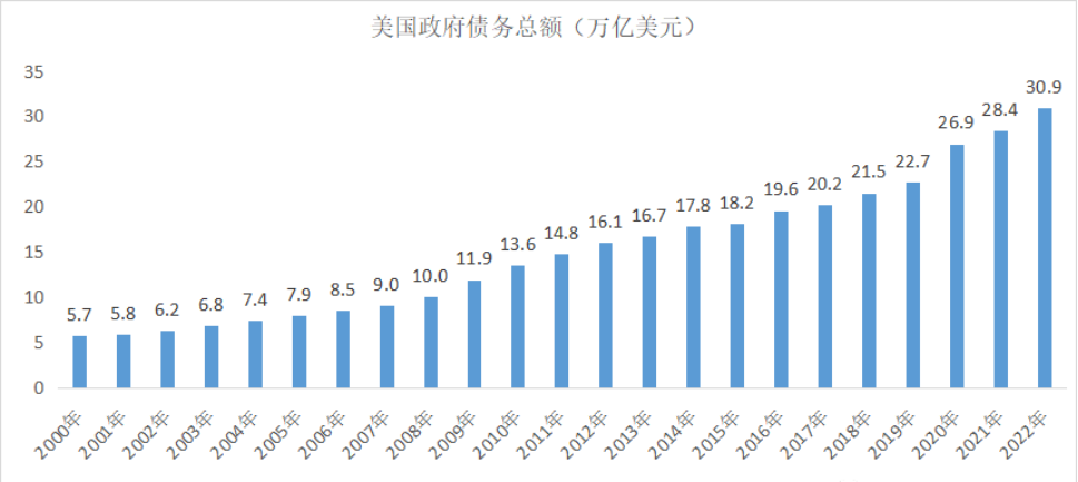 据美国财政部数据,截止2022年9月30日,美国的政府债务总额达到30.9289万亿美元,相当于2021年美国GDP23万亿美元的134.5%。2020年新冠疫情,美国政府再次放水拯救经济,政府债务总额/GDP的比重攀升到129%。2021年,美国经济好转,政府债务/GDP比重下降到123.6%。根据IMF对美国2022年GDP的测算,美国2022年政府债务/GDP的比重将下降到122%。
