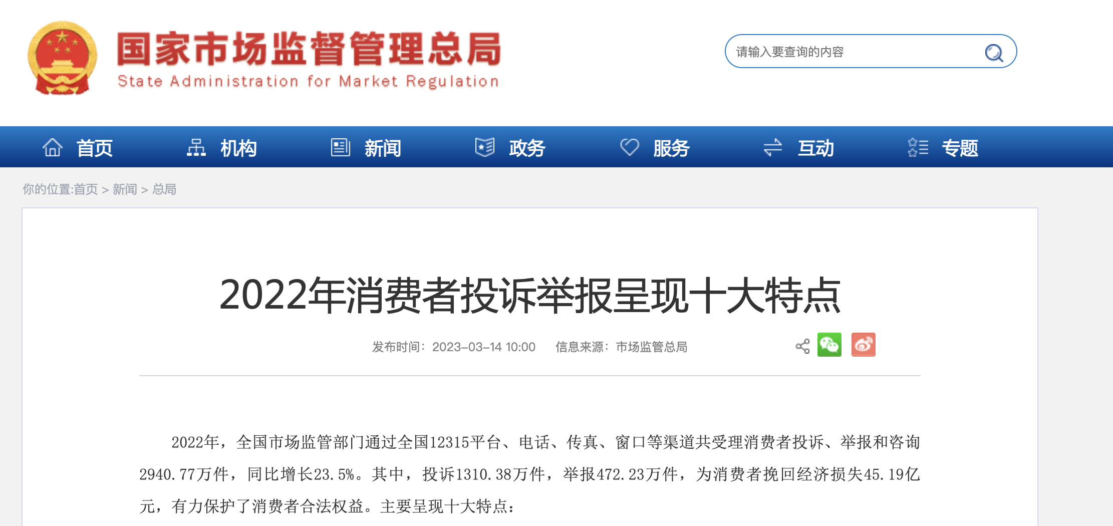 在今年消费者权益日前夕,市场监管总局披露了2022年消费者投诉举报呈现的十大特点,以及相关最新数据。数据显示,2022年,全国市场监管部门通过多个渠道共受理消费者投诉、举报和咨询2940.77万件,同比增长23.5%。其中,投诉1310.38万件,举报472.23万件,为消费者挽回经济损失45.19亿元。