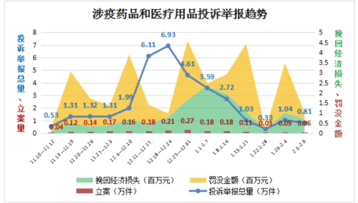 市场监管总局指出,“二十条”和“新十条”出台后,疫情防疫重心从防控感染转到医疗救治,涉疫药品和医疗用品需求激增、供应不畅,价格异常波动、产品质量问题频现,相关投诉举报咨询量一度呈井喷式增长。2022年11月10日至2022年底,全国12315平台接收相关投诉举报24.11万件,同比增长3.88倍,环比增长2.95倍,最高峰值达到19.5倍。其中,投诉14.18万件,举报9.93万件,挽回经济损失498.17万元。