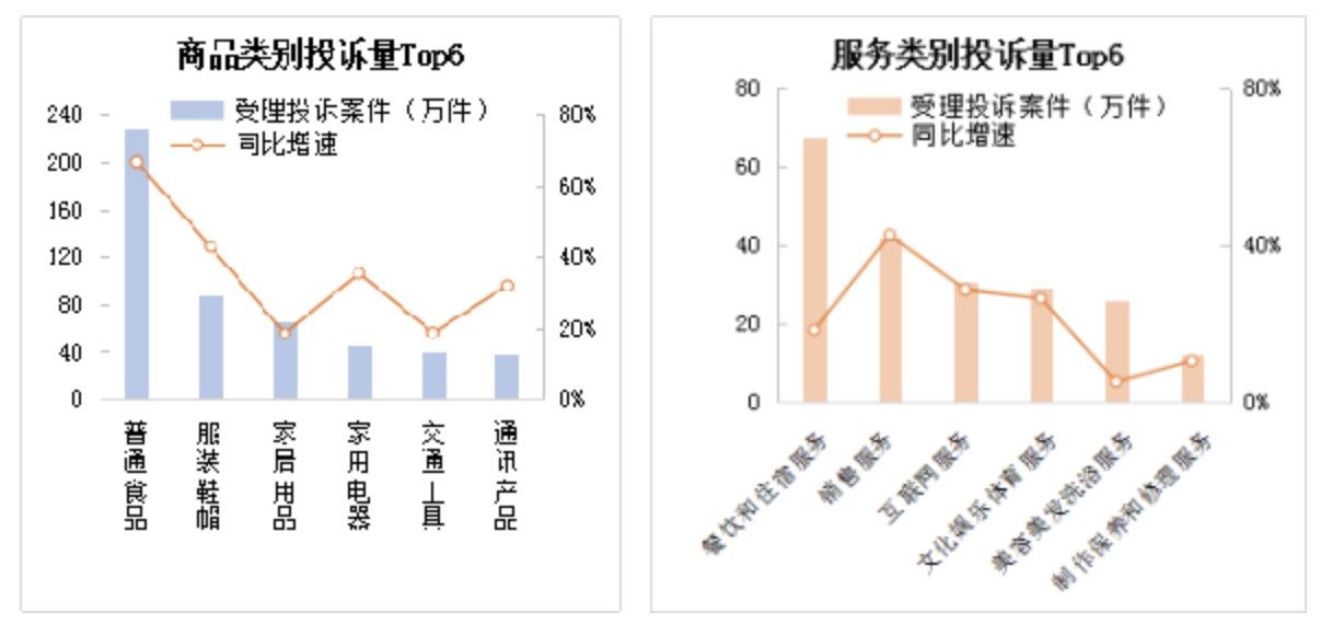 从行业类型来看,舌尖上的安全问题依然引人关注。来自消费者的1310.38万件投诉中,涉及食品安全的有109.06万件。市场监管部门受理的商品投诉及服务投诉中,普通食品与餐饮住宿的投诉量都占比最靠前。