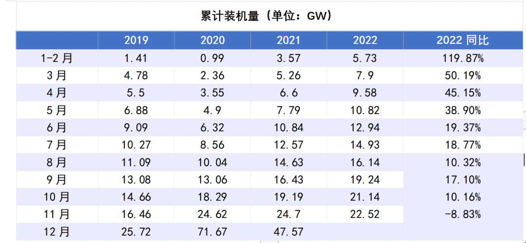 从装机量的数据来看,风电产业2022年高开低走,1-11月装机22.52GW,同比下降8.83%。不过,照以往的惯例来看,12月是并网的高发期,业内给出50-55GW全年较为乐观的装机预期。