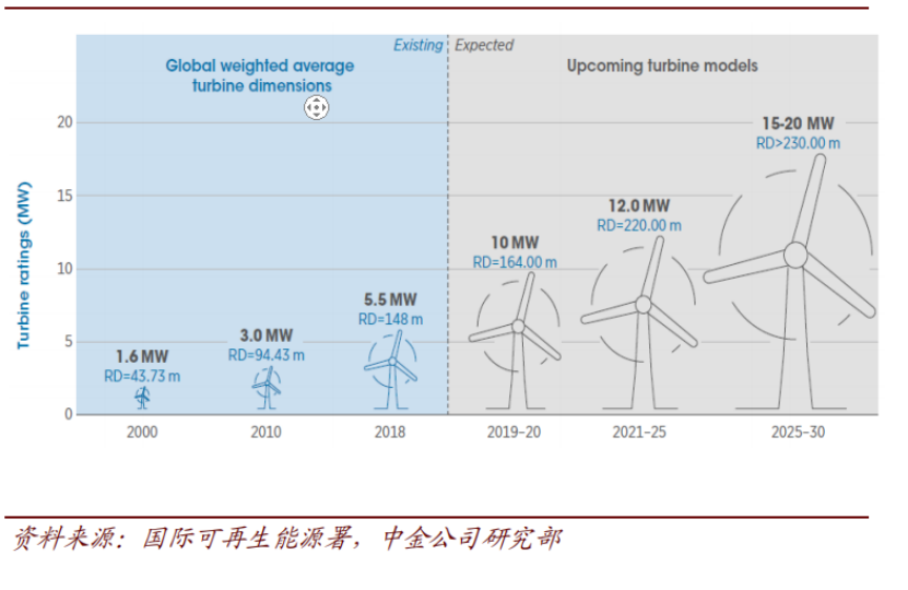 未来海上风电沿着大型化的路径继续前行,形成降本良性循环。