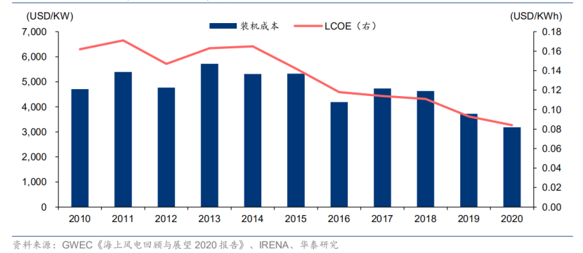 随着装机量的扩大规模化成本效应此时也开始凸显,据IRENA测算,2020年全球海上风电的装机容量每增加一倍,整体装机成本将下降 9%,LCOE将下降15%。
