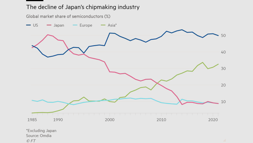 △ 日本芯片制造产业的衰败(来源:Financial Times)